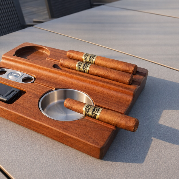 Everything sits in the tray perfectly. Lighter, cutter, ashtray — all right there. The wood finish is nice and the whole thing cleans up easy. Perfect for weekend evenings.